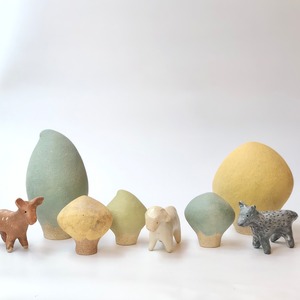 樹のオブジェや小さい一輪挿しなどと一緒に並べると
