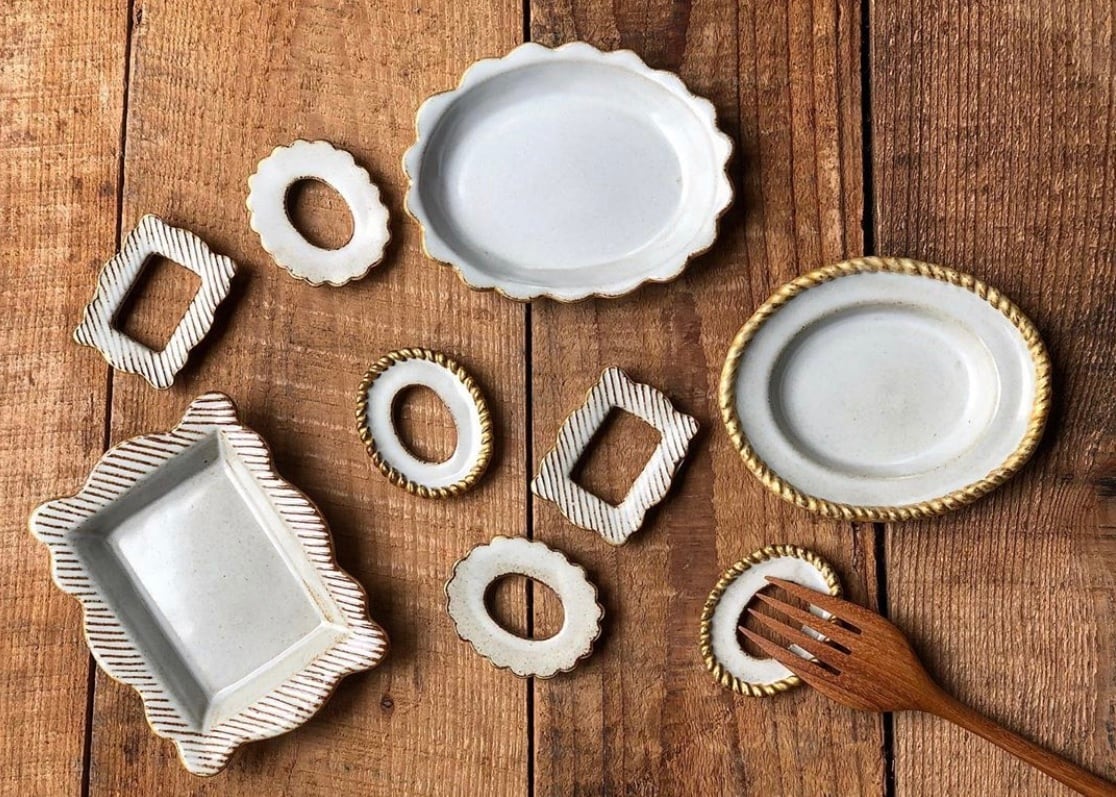 frameシリーズの小皿をそのまま小さくしたカトラリーレストは、同じく「楕円・フリル・角」の3種類。